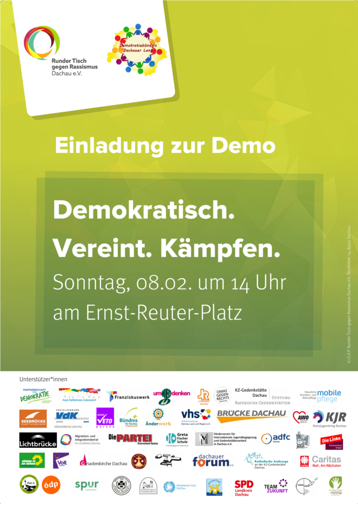 Daher rufen wir, der Runde Tisch gegen Rassismus Dachau und das Demokratiebündnis im Dachauer Land, für den 8. Februar zur Teilnahme an unserer Demonstration auf. In einem Jahr, in dem viele wichtige Wahlen stattfinden, müssen wir die demokratischen Werte in den Mittelpunkt zu rücken.